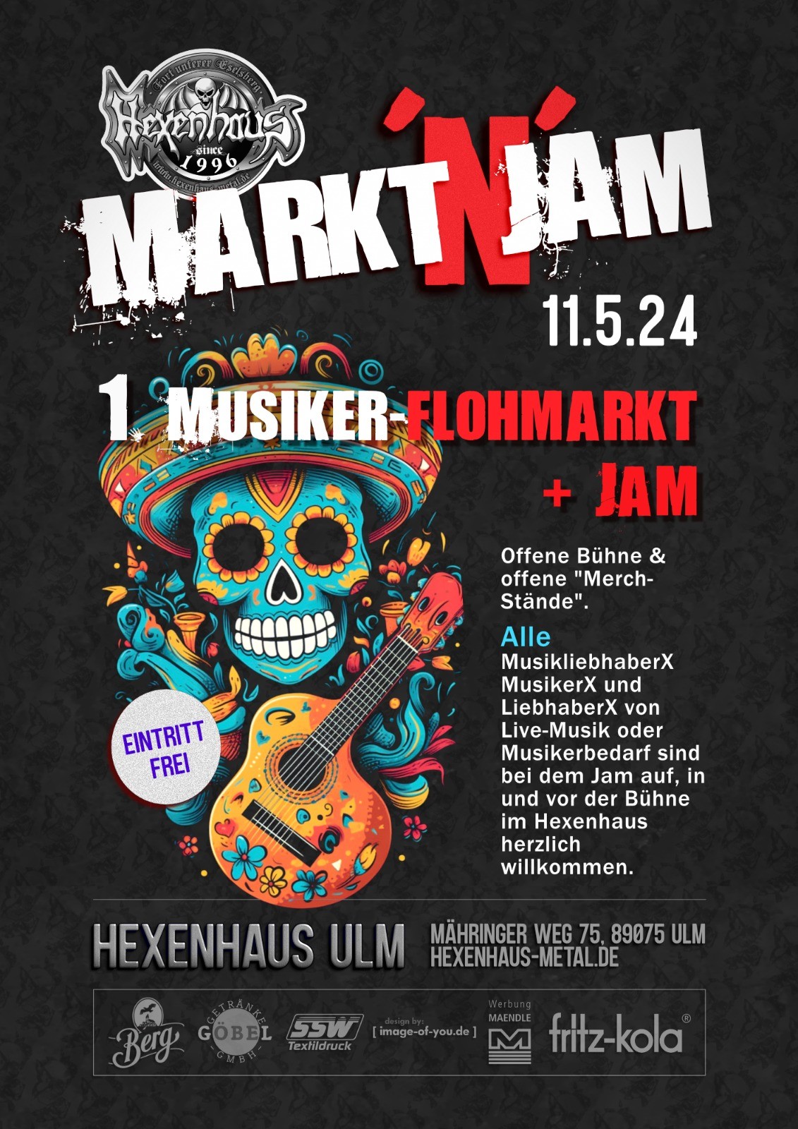 Alle MusikliebhaberX, MusikerX und LiebhaberX von Live-Musik oder Musikerbedarf sind bei dem Jam auf, in und vor der Bühne im Hexenhaus herzlich willkommen.